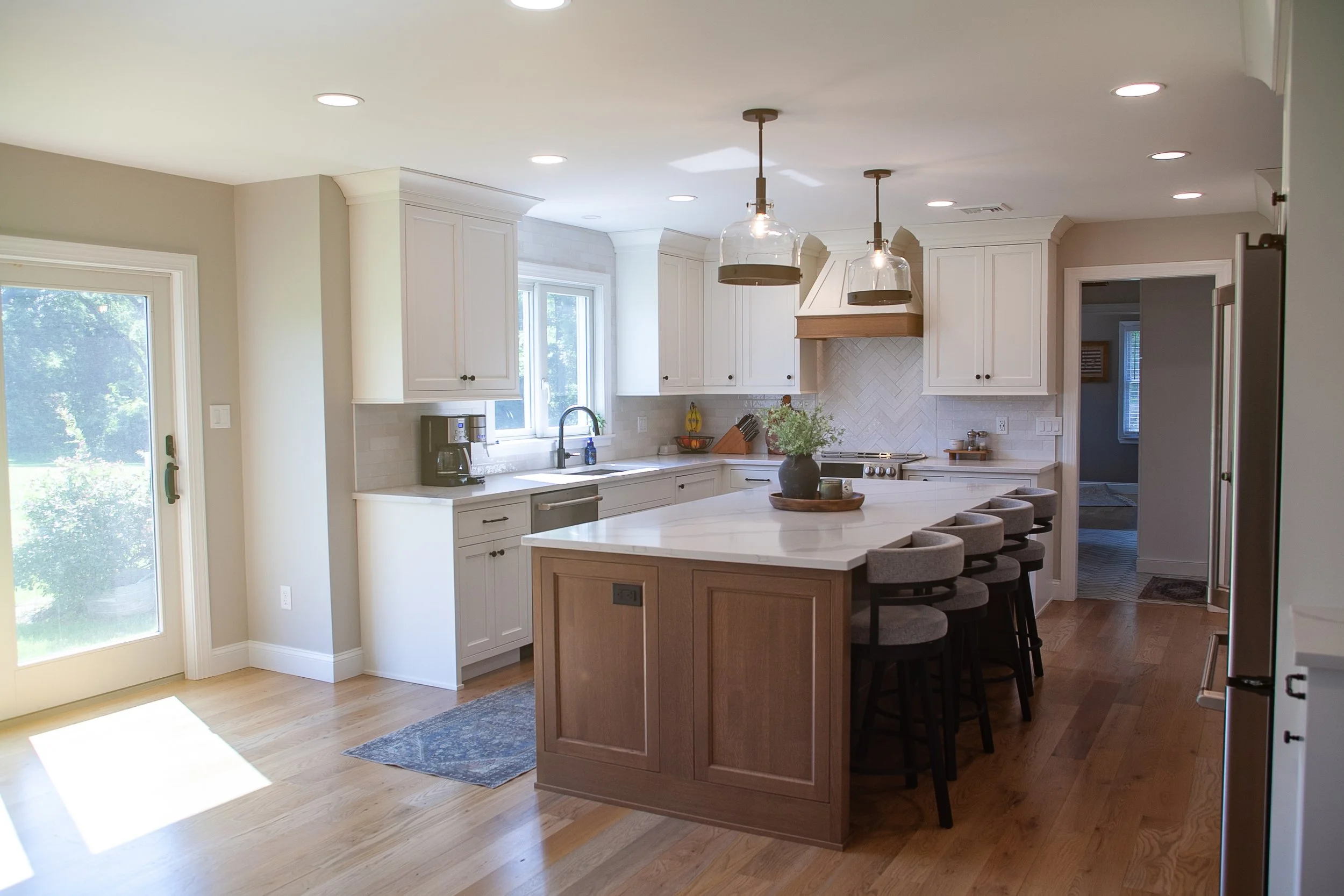 This young family was tired of their dark cramped kitchen. Windows turned into sliding doors, providing a much-needed way to the grill, and the doorway into the dining room shifted, allowing us to frame the opening with cabinetry. The island welcomes family and friends and serves as the center piece for prep work.